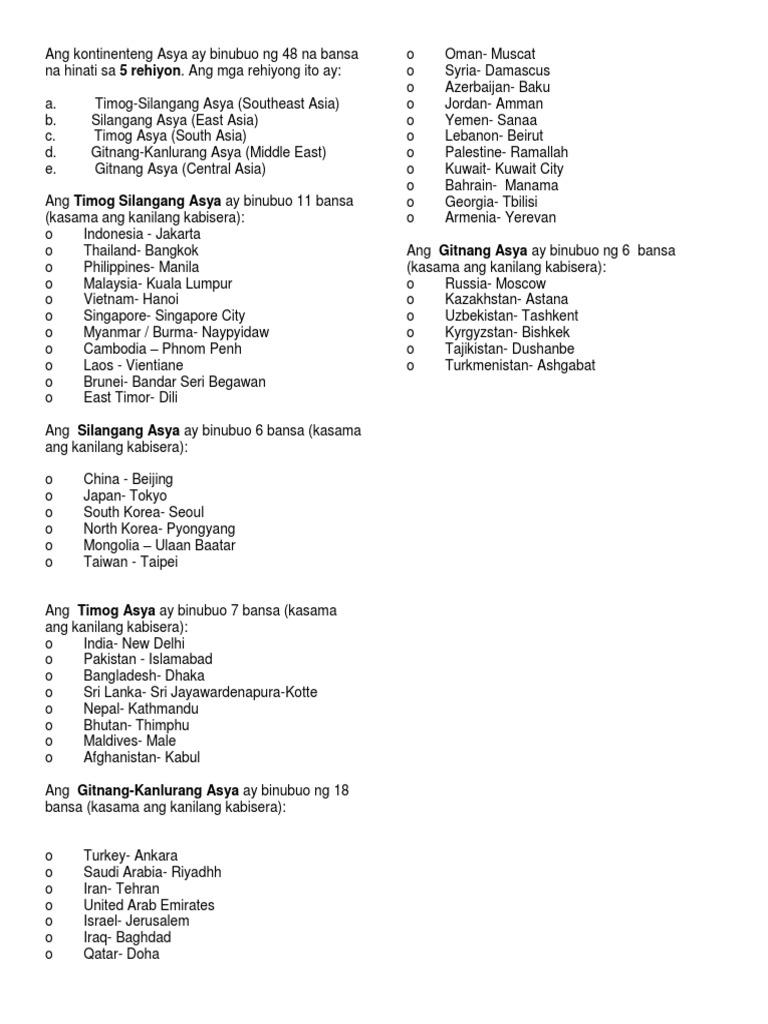 Ang Kontinenteng Asya Ay Binubuo Ng 48 Na Bansa Na Hinati Sa Pdf