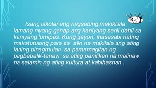 Ipaliwanag ang pag-uugnay nito sa mga pangyayari sa tunay na buhay. Mga Karunungang-bayan sa Panahon ng Sinaunang Pilipino Aralin 1 Mga Kasanayang Lilinangin A. Binubuo ito ng mga sumusunod.