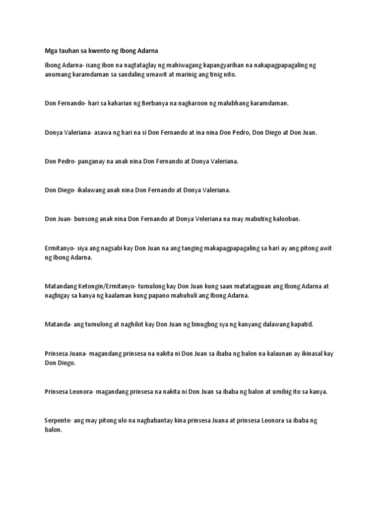 Donya Maria -siya ang anak ni Haring Salermo na may taglay na kapangyarihan. Para naman sa buod ng bawat kabanata bisitahin ang Ibong Adarna Buod ng Bawat Kabanata 1-46 with Talasalitaan. Don Fernando- hari sa kaharian ng Berbanya na.